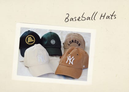 Links: Light tan Yankee hat, Camel Yankee hat, Green hat, No bad dogs hat, London hat