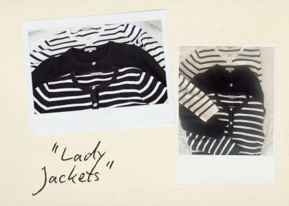 Links: Black lady jacket, Black lady jacket (less expensive), Navy/cream lady jacket, Black/white stripe lady jacket (similar)
