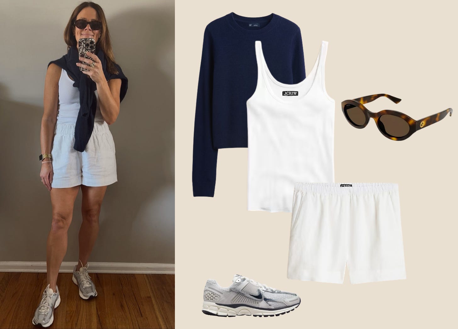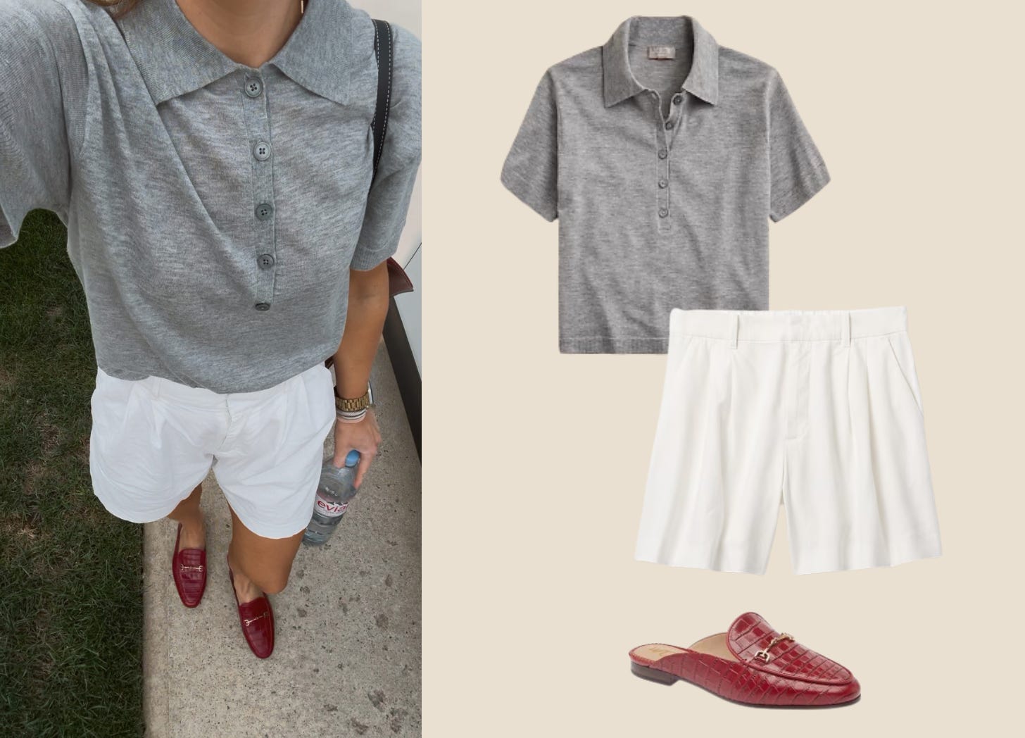 Here’s my take on continuing shorts while leveling up with subtle fall notes: linen shorts paired with a super-light cashmere sweater polo (I sized up…it’s SO dreamy). I added a reddish (cranberry?) mule, and now I have the best of all worlds.
