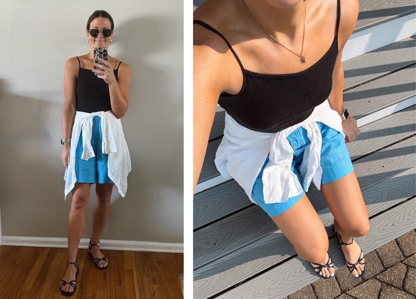 And ya know what? I’m doubling down on shorts this fall by mixing them with unexpected seasonal pairings! The ultimate unlikely BFFs. Picture shorts with loafers and cozy socks, linen with suede accents, or adding dark-colored sandals to keep things interesting and transitional.