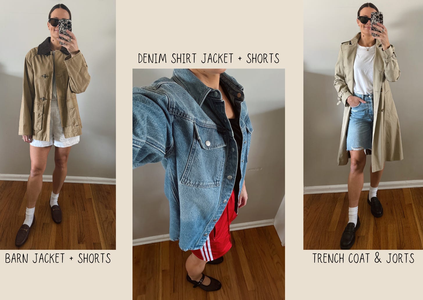 Here’s my take on the coat situation using what I already have. I’m definitely on board with the idea of wearing a long jacket with shorts, but I intend to keep my eyes out for secondhand versions of the cropped looks.