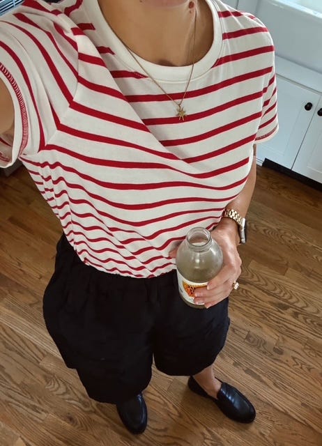 Notes: Loafers + shorts still my favorite unlikely BFF this summer. My daughter says it’s giving, Where’s Waldo. I don’t see jeans or a ski hat, but okay.