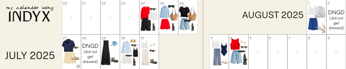Obsessed with Indyx and loved everything about this post. For days I don't get ready (or it's strictly dog walking / sofa attire), I log my fave robe and a selfie I use on repeat or I'll just log the individual items rather than make an outfit: handbag for TJ's run, fave hoodie, etc. There's something so satisfying about a full month of data!